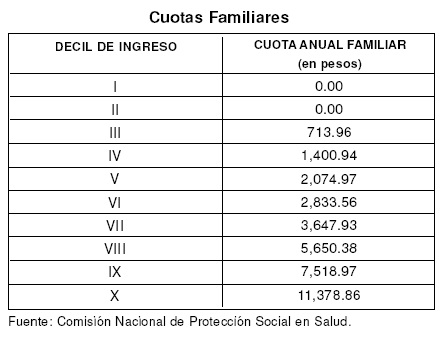 Las cuotas familiares vigentes durante el ejercicio fiscal de 2009 dan una idea de cómo se define el esquema de pago del seguro popular; está pensado como un sistema financieramente sustentable, y al cual puedan acceder personas de distintos niveles de ingreso, con la única condición de no ser derechohabiente de ningún instituto que proporcione protección a la salud.
