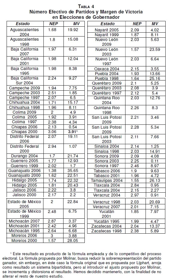 A partir de los datos anteriores, no podemos afirmar categóricamente que todos los sistemas bipartidistas son competitivos, toda vez que hay casos como el Distrito Federal, en el proceso electoral 2006, que se configura como bipartidista, pero con un MV muy amplio, mientras que otros casos como Chiapas, en el proceso electoral 2006, que también es bipartidista, tiene un margen de victoria muy reducido. Además, tampoco podemos afirmar que los sistemas tripartidistas sean los más competitivos, ya que si bien todos los procesos que tienen esta configuración poseen MV reducidos, también los sistemas bipartidistas cuentan con esta característica. En conclusión, los procesos electorales que configuran sistemas de partido con más de un actor dominante, tienden a reducir los márgenes de victoria y a ser más competitivos, estableciendo así una relación causal de mediana fuerza.