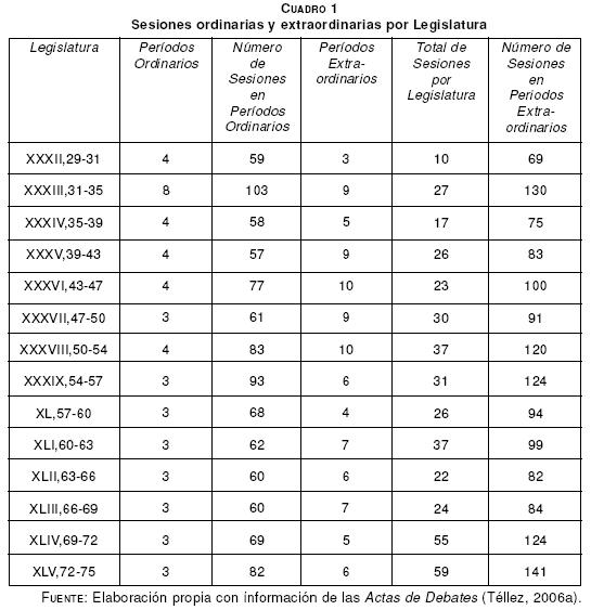 La estabilidad de una legislatura puede observarse por la regularidad en sus sesiones y la regularidad con que es convocada a resolver asuntos que esté obligada constitucionalmente a aprobar. Es decir, a pesar de que las decisiones puedan efectivamente ser tomadas fuera del recinto legislativo o por actores externos al Congreso, éstos no suplantan su función formal y el sello de aprobación de las medidas legislativas son procesadas exclusivamente por el Congreso local. El cuadro 1 presenta un concentrado del número de sesiones ordinarias (previstas en el calendario constitucional dentro de los períodos ordinarios de sesiones) y en períodos extraordinarios (regularmente convocados por el titular del Ejecutivo estatal para aprobar asuntos urgentes). Packenham incluso afirma que simplemente por el hecho de reunirse con regularidad y de manera ininterrumpida, las legislaturas ejercen una función latente de legitimación del sistema político (1970:521-37).