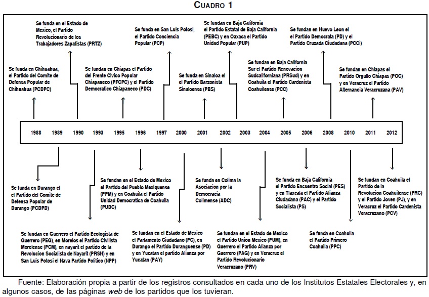 La segunda de ellas la integrarían aquellos partidos locales que obtuvieron su registro durante el período de "instauración democrática" que abarca del año 2000, hasta las elecciones presidenciales del 2012, cuando habría de recuperar la Presidencia de la República el PRI; y la última de dichas franjas temporales la completarían aquellos partidos locales de formación posterior a dichas elecciones presidenciales de julio de 2012 (ver Cuadro 1).