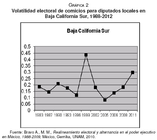 Asimismo, la revisión del índice de volatilidad de las votaciones para diputados locales en los casos analizados también muestra que en una etapa posterior a sus respectivas elecciones críticas se experimentaron procesos de realineamiento con tendencias de creciente inestabilidad del voto en los casos de Aguascalientes (gráfica 1) y Baja California Sur (gráfica 2). Esto se refiere a que si bien en la elección crítica se alcanzó un punto elevado de la volatilidad que posteriormente descendió, una vez re-estabilizándose ha mostrado tendencias de creciente volatilidad, que indican que los grupos de electores están cambiando sus preferencias partidistas en los comicios realizados en los últimos años.