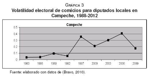 En el Estado de Campeche, el PRI ha mostrado su hegemonía electoral y eso lo podemos observar claramente en los resultados electorales de los años de 1985 hasta el 2009, donde es evidente que el partido triunfador ha sido éste; sin embargo, también es evidente que a partir del año 1997, el PAN comenzó a aumentar sus votos pero sin poder obtener un resultado efectivo para que pudiera existir una alternancia en el poder. Ahora bien, no se debe olvidar que el PRI ha gobernado esta entidad por los últimos 75 años. La contienda, aunque exista presencia de otros partidos, ha sido entre el PRI y el PAN.