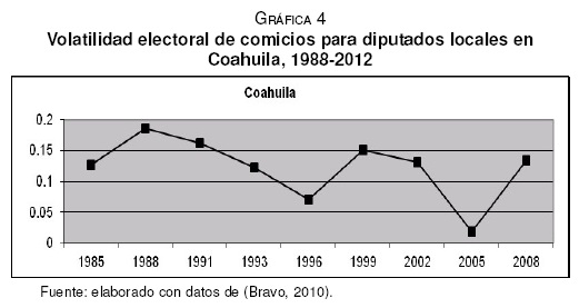 Continuando con este caso, se resalta que Coahuila es la entidad con los niveles más bajos de volatilidad, ya que el 18% de los electores cambiaron sus preferencias de unos comicios a los siguientes, mientras que en el resto de las entidades aquí abordadas dicho índice se ubicó por encima del 32% de los votantes. De tal manera que el partido tricolor es el mayor beneficiado de la relativa estabilidad, o inestabilidad limitada, del electorado coahuilense, y en el que la oposición (principalmente panista) enfrenta serias dificultades para penetrar y consolidarse entre los votantes.