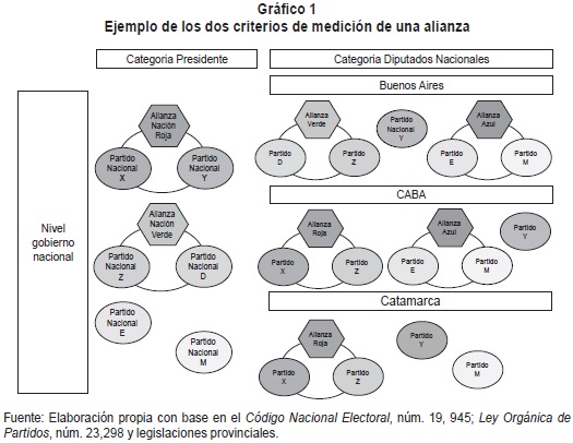Entendemos que una alianza es un nombre, una etiqueta, pero es también la relación que une a los partidos que se alían. En Argentina, ambos criterios no van de la mano, abundan los casos en que un partido participa tanto de las elecciones presidenciales como de las bancas de Diputados en una provincia determinada bajo cierto nombre de alianza, pero los compañeros varían en ambas arenas electorales. ¿Cuál de los dos criterios define, entonces, lo que es la alianza? Ante la imposibilidad de descartar uno de ellos, consideramos ambos. Por este motivo, para medir la congruencia aliancista desarrollamos dos indicadores, uno para cada forma de delimitar lo que es una alianza.