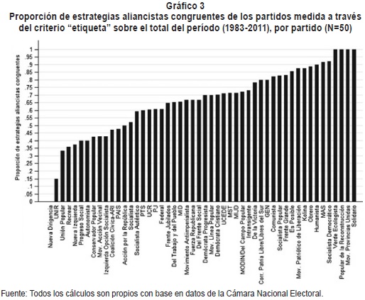 En 2003, la elección en que la congruencia aliancista general llegó a su nivel más bajo, con una proporción de 0,38 de estrategias congruentes sobre el total, la mayoría de los partidos formaron alianzas distintas para Diputados que para Presidente. Contrariamente, unos cuantos partidos se mostraron altamente congruentes como el Movimiento Socialista de los Trabajadores (MST) con una proporción de 0,75 de estrategias congruentes, y partidos con congruencia perfecta como el Partido Obrero (PO), el Humanista y el Popular de la Reconstrucción. En la siguiente elección de 2007, la congruencia aliancista general aumenta casi un 70%. El PO y el MST vuelven a destacarse como los partidos más congruentes de la elección, así como el Partido de la Victoria, mientras que UNIR y la UCR fueron aquellos con menor congruencia aliancista. El primero con una proporción de 0,09 de estrategias congruentes sobre el total y la UCR con 0,16, el que aumenta levemente su congruencia en 2011 a 0,25, aunque sigue siendo uno de los partidos con menor congruencia aliancista. Asimismo, en 2011 podemos destacar que además de la UCR, el Partido Demócrata Cristiano, UNIR y Unión Popular, han sido los partidos con menor congruencia, mientras que el Partido Solidario, Kolina, el Frente Grande, el Partido de la Victoria, el PJ y el ARI, fueron altamente congruentes en sus alianzas de la dimensión horizontal categórica.