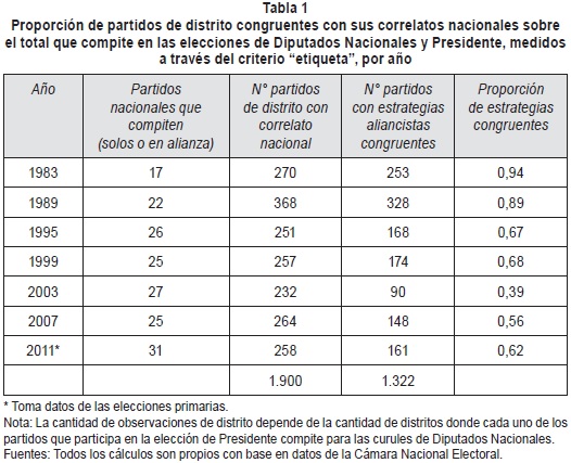 La congruencia aliancista es estudiada a través de los dos indicadores señalados antes sobre los partidos nacionales que presentan candidatos a Presidente (ya sea solos o en alianza) en relación a cada uno de sus correlatos de distrito en cada elección de Diputados Nacionales. Si entendemos una alianza como una etiqueta, podemos observar en la Tabla 1 la proporción de partidos de distrito con una estrategia aliancista congruente con sus correlatos nacionales sobre el total de partidos que compiten en las dos categorías de cargo comparadas, Diputados Nacionales y Presidente, en las elecciones concurrentes entre 1983 y 2011.6