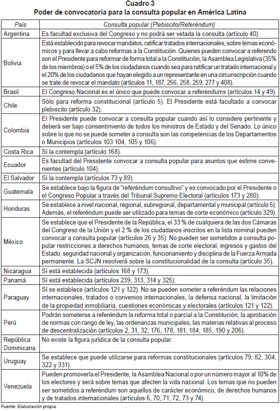 Como lo muestra el Cuadro 3, hasta ahora, República Dominicana es el único país que no ha incorporado en su constitución la figura del plebiscito o referéndum. Los 17 países restantes contemplan la posibilidad de convocatoria a una consulta popular. Las diferencias entre cada país tienen que ver con el actor que convoca (el Ejecutivo federal, algún ejecutivo local, el Poder Legislativo o un partido político), así como los temas que se pueden someter a referéndum y las reglas con las que va a funcionar este ejercicio. Algunas de las constituciones no establecen cuáles son las instituciones que tienen el poder de convocatoria. En países como Chile, Colombia, Ecuador y Guatemala, se establece que el presidente es el único facultado para la convocatoria, ya sea de forma personal o a través de alguna instancia especial, como el caso de Guatemala, en donde lo hace a través del Tribunal Supremo Electoral. En casos como Argentina y Brasil, el órgano al que compete la convocatoria es el Poder Legislativo. Mientras que en Bolivia, Venezuela y México, esta prerrogativa recae en el Ejecutivo, el Legislativo, los partidos políticos, o incluso, en la ciudadanía. En el resto de los países si bien este instrumento está establecido en sus constituciones, no se establece quién es el órgano encargado de la convocatoria.