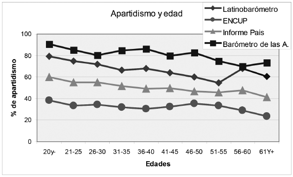 Fuente: Elaboración propia con datos del Latinobarómetro, la ENCUP, el Informe PAÍS y el Barómetro de las Américas.