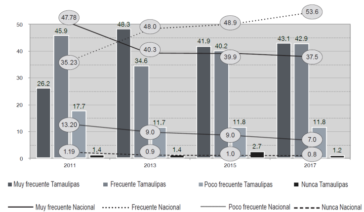 Esta misma encuesta mostró que en el estado de Tamaulipas la distribución de la población de 18 años que percibe la ocurrencia de prácticas corruptas como “muy frecuentes”, se situó en porcentajes de 26.2, 48.3, 41.9 y 43.1, respectivamente; y destaca el incremento sustancial de 2011 a 2013, una pequeña disminución en 2015 para repuntar de nuevo en 2017. Los porcentajes de 2011, 2015 y 2017, se mantuvieron por debajo de la media nacional (35.23, 48.9 y 53.6); sin embargo, en 2013 la entidad se ubicó ligeramente por encima de ese nivel.