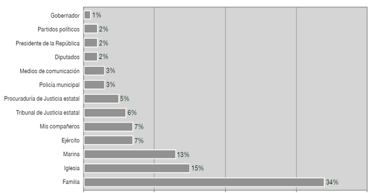 Resulta significativo que en el contexto de inseguridad que prevalece en la entidad federativa, gran parte de los encuestados haya manifestado confiar en mayor grado en las fuerzas armadas, no obstante que a nivel nacional han sido cuestionadas por presuntos actos de abuso de autoridad y corrupción; mientras las instancias encargadas de la impartición de justicia no están entre las más confiables. De la misma forma, dijeron confiar en la familia y la iglesia, instituciones que tradicionalmente han asumido la tarea de transmitir valores esenciales para la convivencia cívica, de modo que pudiera suponerse que en la actualidad no estarían aportando de manera sustantiva a revertir el fenómeno de estudio.