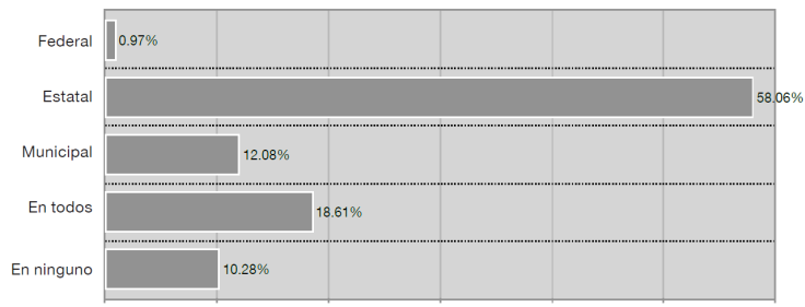 Del total de los encuestados, el 60% opinó que la corrupción se manifiesta en todos los órdenes de gobierno; los restantes consideraron que a nivel estatal existe mayor susceptibilidad de este tipo de actos, mientras que el .97% adujo que no existe en ninguno de los órdenes de gobierno. Por tanto, se encuentra una amplia asociación de los encuestados entre la esfera de gobierno y la comisión de actos de corrupción.