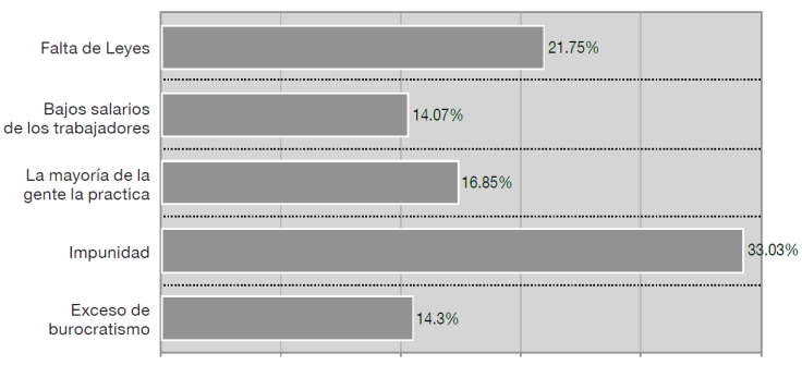 Conforme a las causas de corrupción identificadas en estudios anteriores (Kaiser, 2014), los encuestados respondieron que la impunidad (33%) es determinante en la existencia de conductas corruptas. Como segunda causa se identificó que la práctica constante de actos de corrupción es común en la gente (22%), quedando los bajos salarios de los servidores públicos, la falta de leyes y el exceso de burocratismo, en los últimos lugares. En ese sentido, se puede identificar una relación entre la inacción legal de la autoridad y la cultura, tanto de los servidores públicos como de los ciudadanos, de corromper las reglas para beneficios particulares.