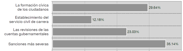 El 35% de las respuestas obtenidas se concentró en que la aplicación de sanciones más severas hacia aquellos que realizan actos de corrupción, es una acción que podría disminuir la incidencia de la corrupción entre los servidores públicos, seguido por una formación cívica de los ciudadanos. Esta acción tiene relación con la impunidad, la cual fue señalada como la principal causa de la corrupción. Es poco fructífero esperar la solución del problema si no existe la aplicación pronta, expedita y eficiente de la Ley, entre otras acciones.