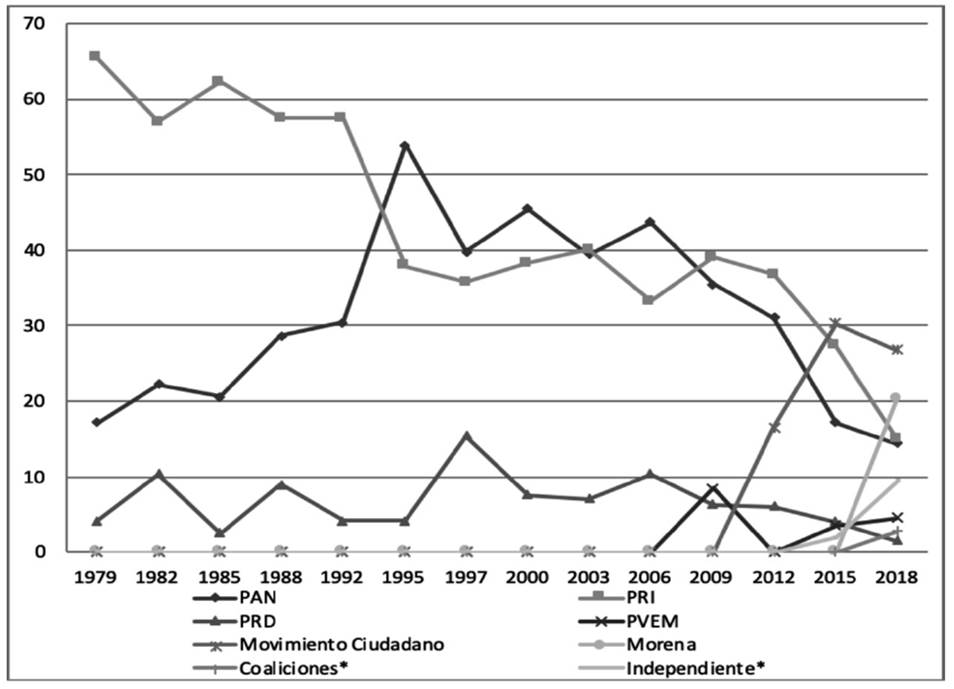 Si se observan los resultados en la elección de diputados por el principio de mayoría relativa, se pueden observar tres fases en la transición política local. De tal modo, que en un primer momento (1979-1995) se hace presente el sistema de partido hegemónico, manifestándose su caída estrepitosa en el año de 1995. El segundo momento es el que va de 1995 a 2012, donde hubo un sistema de competencia bipartidista entre el PAN y PRI. Aunque hubo momentos de convergencia o superposición de una fuerza política contra la otra, desde 2009 se observa la caída de estos dos partidos políticos en las preferencias electorales. Así, del año de 2012 a 2018 emerge una tercera fase en la competencia político-electoral donde acontece el tránsito de un incipiente multipartidismo moderado a un multipartidismo fragmentado en la competencia electoral (ver Gráfica 1).9