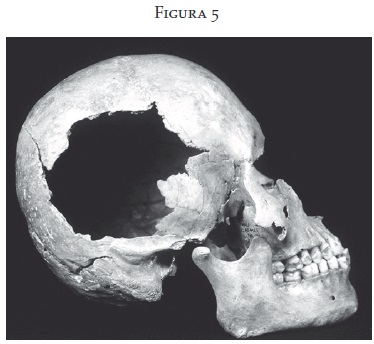 Con respecto a las otras huellas de manipulación, el cráneo 1A presenta huellas de desarticulación en el atlas y el foramen magnum y huellas de raspado para la remoción del periostio; el cráneo 1B presenta huellas de desollamiento y una fractura con perforación del hueso parietal izquierdo, producto de un golpe con un instrumento punzocortante; el cráneo 3B no presenta ninguna otra huella de manipulación además de la perforación en el lado derecho del cráneo; el cráneo 5 sólo presenta huellas de raspado; y el cráneo s/n tampoco presenta otras huellas de manipulación además de la perforación en el lado derecho del cráneo. Otro dato es que cuatro de estos individuos tienen deformación cefálica intencional, dos del tipo tabular erecta (1A y 5) y dos del tipo bilobulada (1B y s/n).3