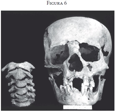 Figura 6. Vista frontal del cráneo 1B y vértebras cervicales: ofrenda 1-lumbrera 14 (MTM).