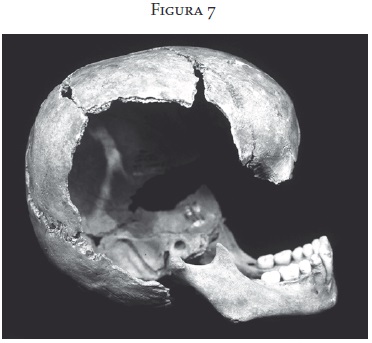 Del total de 15 individuos, siete corresponden a fragmentos de cráneos (lumbreras 1, 9 y 13) pertenecientes a sujetos adultos de sexo indeterminado que presentaron cortes en sus huesos parietales y otras huellas de manipulación intencional. El contexto arqueológico de hallazgo de esos fragmentos no se relacionó directamente con un contexto de ofrendas enterradas; además los fragmentos de las lumbreras 9 y 13 pertenecían a material de relleno colonial de origen prehispánico (Tabla 1).2