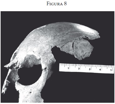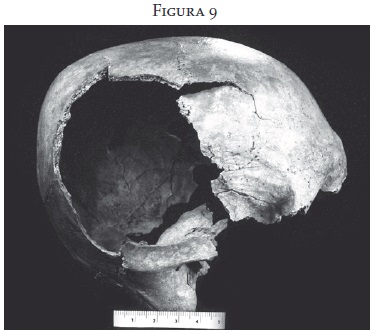 Por otra parte, ocho individuos (Figuras 3 a 10 (4, 5, 6, 7, 8, 9)) corresponden a cráneos completos o parcialmente completos (lumbreras 4, 8, 14 y 17) de adultos (20 a 30 años) o adultos jóvenes (14 a 16 años), de los cuales cinco son de sexo femenino, dos masculino y uno indeterminado [Bass, 1987; Brothwell, 1987; Ubelaker, 1989; White, 2000]; algunos de ellos presentaron deformación cefálica intencional de los tipos tabular erecta y bilobulada [Dembo e Imbelloni, 1938; Román Berrelleza, 1990]. Todos los cráneos presentaron varios tipos de manipulación intencional perimortem: desollamiento, descarnamiento, raspado, perforaciones circulares en parietales y temporales derechos y/o izquierdos, fracturas, golpes, desarticulación y huesos cocidos (hervidos) [Botella et al., 1998]; esos ocho individuos pertenecían a cuatro ofrendas del grupo III de cráneos decapitados [López Arenas, 2001:77-102]: ofrenda 1-lumbrera 4, ofrenda 1-lumbrera 8, ofrenda 1-lumbrera 14, ofrenda 1-lumbrera 17 (Tabla 1).
