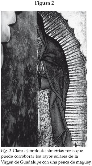 Regresando a la parte estética de la virgen de Guadalupe el siguiente icono de interés es el correspondiente a los rayos solares. Si prestamos un poco de atención a esa esfera gráfica de la imagen y la condensamos en la idea de un juego de simetrías rotas, esos rayos solares son la representación de una penca de maguey (Fig. 2). De esa forma esta planta forma parte de la obra estética.