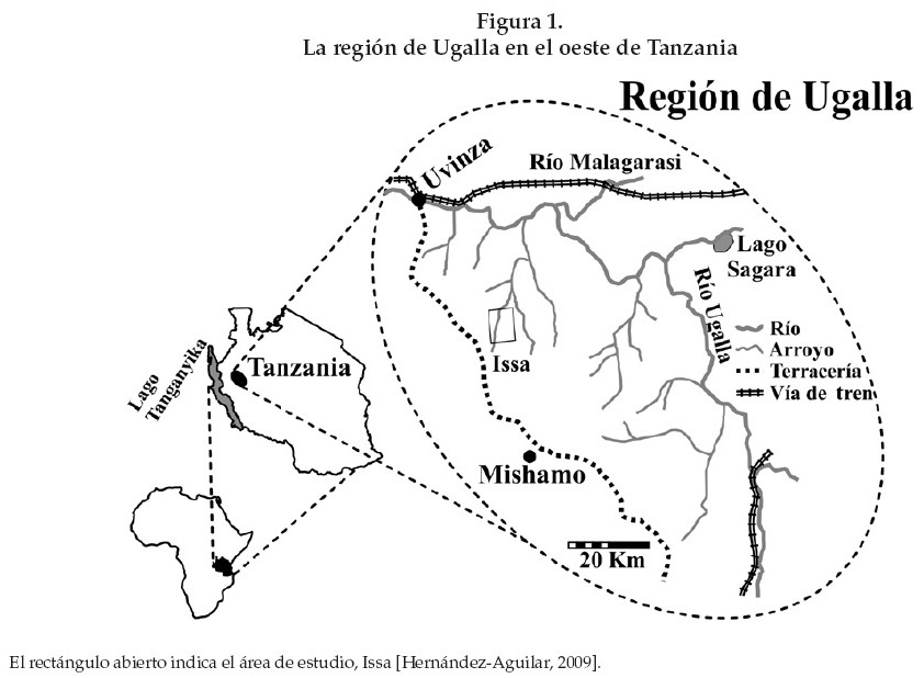 La región de Ugalla se localiza al este del lago Tanganyika, en el oeste de Tanzania; delimita al norte con el río Malagarasi, al sur con la cuenca de Niamanzi (Ilumba), al oeste con el camino Uvinza-Mpanda, y al este con el río Ugalla (Figura 1). Su extensión es de aproximadamente 3 300 km2 y consiste en numerosos valles interrumpidos por cerros con laderas pronunciadas que generalmente culminan en mesetas [Kano, 1972; Moore, 1994]; los rangos de las elevaciones van de los 900 m a los 1800 m. Las corrientes de los ríos Malagarasi y Ugalla son perennes, pero se ubican lejos del área de estudio de Issa (Figura 1); al interior de la región de Ugalla sólo hay arroyos, la mayoría estacionales [Kano, 1972; Moore, 1994].