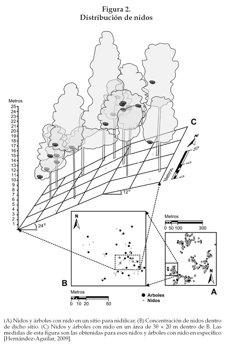 Cuando localizábamos un nido o una concentración de nidos se registraban los alrededores en un radio de 100 m para localizar otros. Un sitio de nidificación se define como cualquier lugar donde haya ocurrido esta actividad, que incluya uno o más nidos en uno o más árboles. Los límites del sitio se ubicaron donde no se encontraron nidos en 100 m o más a la redonda, con respecto a los últimos nidos detectados en el sitio.