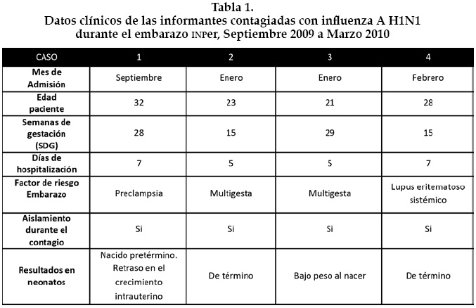 Como podemos observar, las semanas de gestación (SDG) que tenían al momento de haberse contagiado de la influenza eran de 15 y 28, todas fueron hospitalizadas y sometidas a medidas de aislamiento estricto. Cada una de las pacientes aparte del contagio de influenza, tuvo otras condiciones que establecieron un riesgo para su embarazo, como fueron: una mujer era portadora de una enfermedad autoinmune (lupus eritematoso generalizado), otra cursó con elevación importante de su presión arterial (preeclampsia) y dos eran multigestas. Respecto a sus bebés, vemos que dos nacieron en término, es decir, a tiempo y con un peso adecuado; uno nació de bajo peso, y el cuarto nació pretérmino, quien además tuvo retraso en el crecimiento intrauterino. Cabe destacar que ninguno de los problemas maternos y de los recién nacidos fueron ocasionados por la influenza.
