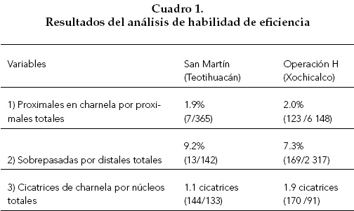 Al enfocarse en estos datos, es posible cuantificar los errores de los talleres de San Martín y la Operación H (cuadro 1). Como mencioné anteriormente, la Variable 1 es el porcentaje de proximales con charnela por el número total de secciones proximales. Hay terminaciones en charnela en 1.9% de las secciones proximales de San Martín y en 2.0% de las secciones proximales de la Operación H. La Variable 2 era el porcentaje de terminaciones sobrepasadas por el número total de secciones distales. En este caso, había terminaciones sobrepasadas en 9.2% de las secciones distales recuperadas de San Martín y en 7.3% de las de la Operación H.