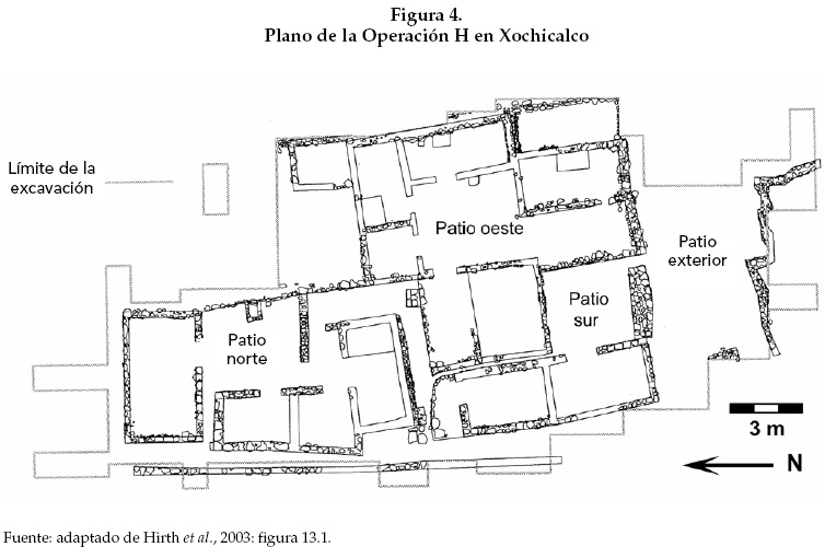 La excavación del taller como parte de la Operación H en Xochicalco reveló una cantidad considerable de subproductos de núcleo-navajas y herramientas de piedra tallada en asociación con varias áreas de actividad (véase Hirth [2006] para una descripción detallada). Este contexto era un solo conjunto residencial con tres patios unidos (figura 4) que servía de residencia para una familia extendida de 10 a 20 personas (Hirth et al., 2000:tablas 7.1 y 7.3). Así, los talleres del Complejo San Martín y la Operación H representan contextos sociales comparables de producción, aunque la familia que habitaba el Conjunto San Martín era considerablemente más grande.