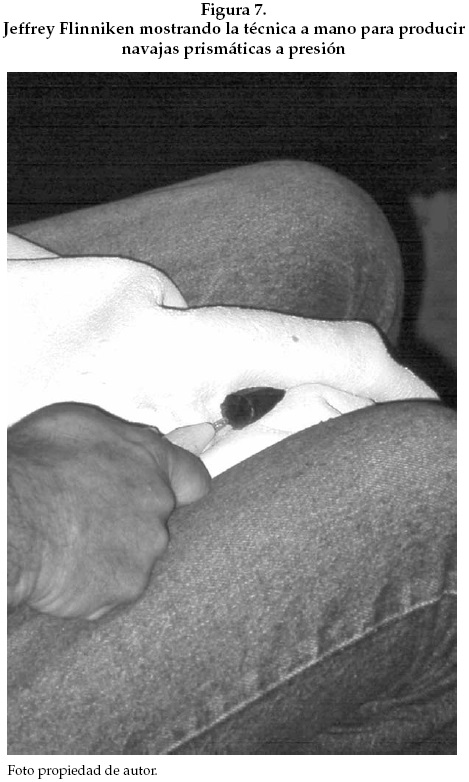 Además de las plataformas de una sola faceta que se utilizaban en Teotihuacán, la secuencia de la producción de navajas también empezó con núcleos poliédricos más grandes. Es probable que estos núcleos requirieran de una técnica de extracción que empleaba el apoyo de los pies, lo que permitía que el productor generara una fuerza considerable utilizando los músculos abdominales (figura 6) [Titmus y Clark, 2003:85]. Por el contrario, los núcleos relativamente más pequeños de Xochicalco probablemente fueran reducidos con una técnica de mano que generaría menos fuerza durante la extracción de navajas (figura 7) [Flenniken y Hirth, 2003]. Hacen falta más experimentos para identificar si, y bajo cuáles condiciones (p. ej., tamaño del núcleo, tipo de plataforma), se asocian ambas técnicas con frecuencias considerablemente diferentes de errores. Tales diferencias tecnológicas pueden afectar significativamente la viabilidad de utilizar datos sobre la habilidad para comparar los niveles de la intensidad en la producción de núcleo-navajas en Teotihuacán y Xochicalco.