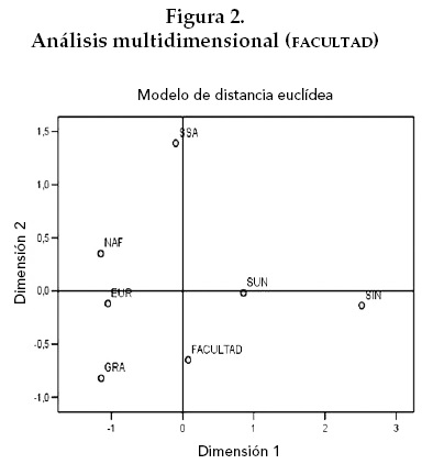 Esta circunstancia nos otorga la posibilidad de aseverar que la muestra de la facultad pertenece a una población más cercana a las poblaciones europeas y, en consecuencia, menos mestizada con población autóctona americana, en comparación con la población que es representada por la muestra de Xpujil, ya que la muestra de la facultad, como ya se dijo, revela distancias biológicas menos acusadas con respecto a las poblaciones europeas, en tanto que la muestra de Xpujil vemos que está más relacionada con poblaciones mongoloides, sean éstas sundadontes o sinodontes, como lo podemos apreciar en los valores de MMDS de la tabla 3 y las distancias que se exponen en los análisis multidimensionales respectivos (figuras 1 y 2).