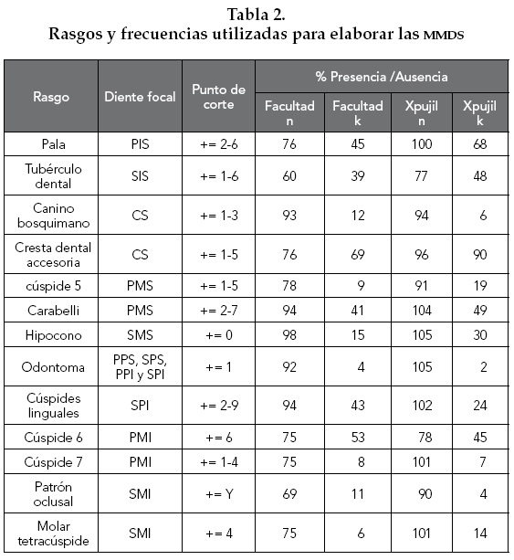 Se calcularon las frecuencias de aparición para cada uno de los rasgos considerando lado izquierdo y derecho, posteriormente se eligieron los dientes antiméricos que presentaban el mayor grado de ausencia o presencia del rasgo observado. Una vez hecho esto, se procedió a elegir los dientes focales y se les asignó el punto de corte más adecuado para registrar entre presencia y ausencia en cada comparación realizada; esto se debe a que los diferentes investigadores en sus publicaciones (de las cuales se tomaron los datos para comparar con otras poblaciones extracontinentales) establecen distintos grados como mínima manifestación para que éste sea considerado como presente o ausente; así también, la exigencia de que los rasgos sean dicotómicos se debe a un requisito para poder calcular las MMDS y sus varianzas [Sjovold, 1977]; los puntos de corte que fueron utilizados en cada una de las comparaciones se pueden ver en la tabla 2. Este procedimiento se realizó en 13 rasgos, ya que los trabajos publicados por otros autores con los que serían comparados los nuestros contaban con sólo ese número de rasgos con posibilidad de contrastar. En esta tabla también se pueden apreciar las frecuencias de presencia/ausencia de estos rasgos para la series de Xpujil y de Mérida (facultad).