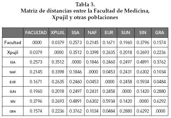 Estos resultados un tanto extraños nos llevaron a considerar nuevamente a las muestras yucatecas de manera separada con el propósito de verificar si se producía el mismo efecto en cada una de ellas y cotejar si las semejanzas o disimilitudes fenéticas se modificaban. Advertimos de ese modo, en la tabla 3, y dejando a un lado por el momento la semejanza probada estadísticamente entre las muestras de la facultad y Xpujil, que la muestra de la facultad es menos diferente, en primera instancia, con respecto a la muestra que corresponde a los granadinos; en segundo término, con la de los europeos, y en tercer orden, con la perteneciente a los sundadontes, en tanto que la muestra de los sinodontes es la que revela la distancia mayor y, por ende, la diferencia fenética más manifiesta en relación con la de la facultad; por su parte, la muestra de Xpujil es menos disímil con respecto a la muestra que corresponde a los sundadontes, siguiéndole en el orden la de los granadinos y en tercera posición la de los europeos, mientras que la muestra de los sinodontes aparece en cuarto lugar en esta gradación de desigualdades, comportándose de manera diferencial en relación con lo que se observa en la muestra de la facultad. No hay que olvidar que en estudios anteriores [Gallardo, 2001] hemos comprobado que las poblaciones europeas españolas muestran la distancia biológica más grande precisamente con respecto a las poblaciones sinodontas.