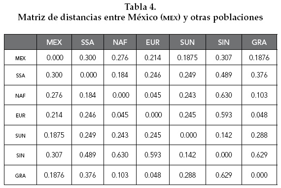 Así, la Medida Media de Divergencia entre la muestra de la Facultad de Medicina y la de Xpujil, como se puede apreciar en la tabla 3, es de 0.0379 y en donde su desviación estándar fue de 0.0893, de ahí que dos veces la desviación estándar nos diera un valor de 0.1786; esto nos llevó a que la hipotesis nula (P1= P2) a un nivel de significancia del 0.03 fuera aceptada; es decir, que las poblaciones de la Facultad y de Xpujil están cercanas una de otra, de tal manera que no hay diferencias significativas entre ellas. Este resultado nos permitió reunir las dos muestras en una sola (denominada ahora como MEX) para confrontarla con otras poblaciones y ubicarla en un ámbito global. Las poblaciones comparadas fueron las siguientes: africanos subsaharianos (SSA), africanos del norte (NAF), europeos continentales (EUR), poblaciones sundadontes (SUN), poblaciones sinodontes (SIN) y poblaciones españolas granadinas (GRA) (v. tabla 4 y para tener más información sobre las características de estas poblaciones, v. Gallardo, 2001).