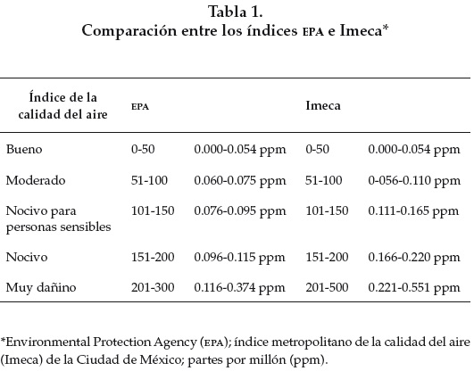 Por razones desconocidas los estándares mexicanos para la Ciudad de México están fuera de cualquier norma internacional (<http://www.sma.df.gob.mx/simat2/>). En la tabla 1 se observa que los índices de la EPA y los Imeca en la Ciudad de México sólo coinciden en el nivel "bueno" (0-50 ppm de ozono). Nótese que los niveles calificados como moderados en la norma mexicana corresponden a los niveles nocivos de la EPA. Estas diferencias son importantes porque el consejo que se da a la población para la protección de su salud depende del índice. Mientras que en México, cuando los niveles van de 51 a 100 Imecas se recomienda que sólo las personas sensibles consideren limitar el ejercicio prolongado al aire libre; con la misma concentración de ozono la EPA recomienda que las personas sensibles eviten el ejercicio prolongado al aire libre y que toda la población debe limitar el ejercicio prolongado al aire libre.
