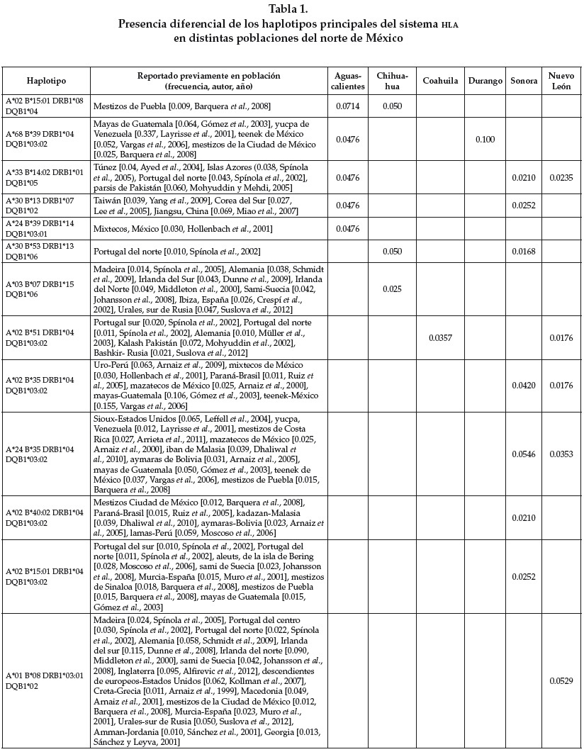 Ante tal complejidad, el estudio de los alelos y haplotipos del sistema HLA en las distintas poblaciones de México (tanto originarias como producto del mestizaje biológico) aporta datos de interés sobre la diversidad que resultó de los procesos de conquista y colonización, sobre la recepción de nuevas variantes y asociaciones en el sistema y sobre el impacto que éstas tuvieron en la formación del acervo genético de las poblaciones mexicanas actuales. Con el objetivo de evaluar la diversidad de los haplotipos de este sistema en las distintas poblaciones de México, se analizaron datos de haplotipos HLA de clase I (HLA-A, -B) y clase II (-DRB1, -DQB1) a partir de individuos y familias mestizadas que provienen de distintas concentraciones urbanas de los siguientes estados del país, agrupados por localización geográfica: la zona norte comprendida por Aguascalientes (n=21), Chihuahua (n=20), Coahuila (n=28), Durango (n=15), Nuevo León (n=85) y Sonora (n=119); la región occidente con los estados de Sinaloa (n=124), Jalisco (n=142) y Michoacán (n=94); la zona costera del Golfo de México que incluye a Tamaulipas (n=32), Veracruz (n=628) y Yucatán (n=230) y la zona centro del país con Querétaro (n=21); y la zona metropolitana del valle de México (ZMVM, que incluye el Estado de México, Distrito Federal, Hidalgo [Rébora et al., 2001] y Morelos, n=939). Estos 2 498 individuos fueron reclutados por las instancias de salud responsables de los trasplantes a nivel regional y se trata únicamente de mexicanos de nacimiento en el estado al que se hace referencia. Todas las tipificaciones se realizaron por medio de PCR-SSP (Polymerase Chain Reaction-Sequence Specific Primer), revelado en gel de agarosa (ABDRDQ SSP Unitray, Invitrogen, Life Technologies Corp., Carlsbad, California, Estados Unidos). Sobre 100 % de estos haplotipos, se calcularon los porcentajes que corresponden a cada una de las ancestrías propuestas: africana, asiática, nativa americana y europea, con base en la presencia/ausencia de cada asociación en las regiones geográficas antes mencionadas [González et al., 2011].