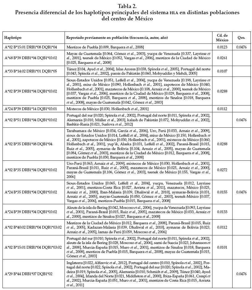 Cabe mencionar que las proporciones aquí presentadas se basan en los reportes previos de haplotipos en poblaciones ancestrales; sin embargo, los haplotipos cuya ancestría no pudo ser determinada por esta vía han sido dejados fuera del análisis. No obstante, cuando se observa la proporción de estos "haplotipos de origen desconocido" destaca el hecho de que la mayor proporción de ellos se sitúe en las metrópolis más antiguas y más densamente pobladas del país. Esto podría ser reflejo de la generación de nuevos haplotipos a partir de un acervo genético con ancestrías de distintas partes del mundo, razón por la que los estudios poblacionales actuales (enfocados principalmente en describir la diversidad de las poblaciones originarias de cada región geográfica) no han encontrado aún estos bloques. Asimismo, se debe tener en cuenta que la diversidad original del sistema en las poblaciones nativas de México antes de la conquista se vio mermada por las enfermedades y que aquellos haplotipos no capaces de hacer frente a las infecciones (virales) traídas por los conquistadores se extinguieron y, por lo tanto, las poblaciones indígenas actuales posiblemente no guardan variantes o haplotipos que algunos individuos mestizos sí poseen. Es plausible pensar que un individuo mestizo, con un haplotipo originario y otro importado, pudo haber resistido de mejor manera los embates de las epidemias con respecto a un individuo autóctono con dos copias de haplotipos no seleccionados positivamente para hacer frente a estos nuevos patógenos. Si el individuo mestizo sobrevive, puede heredar el haplotipo originario a su descendencia y, por lo tanto, preservar este vestigio de la diversidad nativa de América.