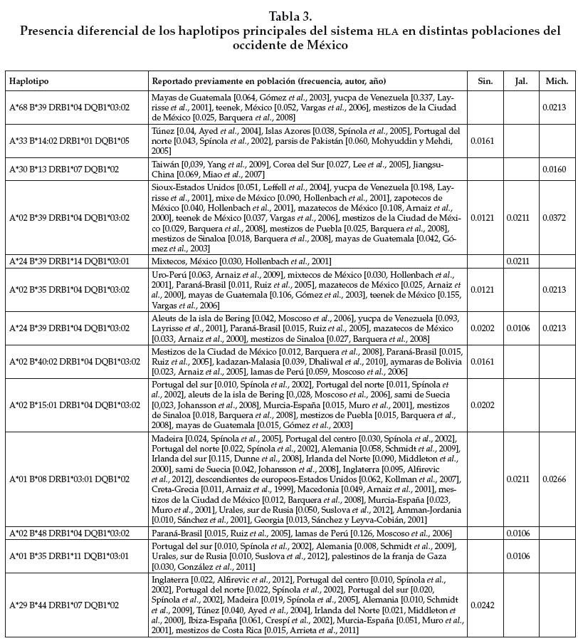 En resumen, el polimorfismo en el sistema refleja las contribuciones ancestrales en proporciones congruentes con los reportes anteriores y los datos históricos previamente analizados, y abre una ventana a la dinámica de poblaciones de cada región. Los haplotipos encontrados muestran la contribución nativa americana, africana, europea y asiática de manera desigual en las entidades analizadas y presentan la proporción de haplotipos no reportados que posiblemente sean producto de la recombinación de haplotipos ancestrales de las poblaciones parentales, o de haplotipos que en las poblaciones originarias analizadas se han perdido por la selección natural provocada por el enfrentamiento de los sistemas inmunes ancestrales a los patógenos nuevos encontrados, ya sea como resultado del contacto de las poblaciones autóctonas con los agentes infecciosos traídos por los conquistadores y sus esclavos, o de los inmigrantes con los patógenos originarios de América. Adicionalmente a los estudios a realizar con asociaciones de dos puntos en lugar de la aproximación por haplotipos, y con la intención de rescatar la información de la diversidad originaria del sistema HLA que posiblemente se perdió durante las epidemias mencionadas, se deberían realizar estudios a nivel del DNA en restos óseos y momificados de los individuos fallecidos antes del periodo de contacto. El estudio de la diversidad biológica de este sistema no sólo es de importancia en la genética de poblaciones y, por lo tanto, de la antropología, sino también en la elaboración de políticas de salud encaminadas a la elaboración de bancos de donadores de órganos o células, en el entendimiento de la expansión de las oleadas epidémicas (eventuales o estacionales), en la interacción organismo-fármaco e incluso en la propensión al desarrollo de enfermedades autoinmunes.