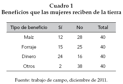 Según las mujeres encuestadas, las ganancias se invierten en dos rubros igualmente importantes: producción agrícola y necesidades familiares. Sin embargo, ellas se relacionan poco con esta inversión. El cuadro 1 muestra que poco más de la mitad dijo recibir beneficios económicos de la tierra, y que el número de quienes reciben beneficios en especie (forraje y maíz) es todavía más reducido.