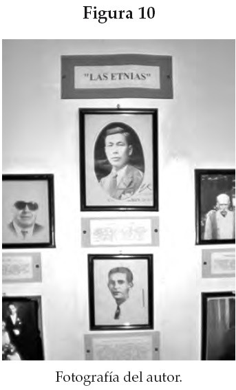 En uno de los paneles más llamativos, un cartel amarillento anuncia "las etnias" (véase la figura 10). En él se aprecian cinco fotografías en blanco y negro, enmarcadas en cartulina. Las mismas corresponden a: 1) Un hombre de origen chino que llegó al pueblo al comienzo de la década de 1920 y se dedicó al comercio; 2) Un panadero italiano también llegado en la década de 1920; 3) Dos españoles refugiados de la Guerra Civil Española; 4) Un español que llegó del Distrito Federal; 5) Una mujer alemana arribada a fines de la década de 1930. Algunas de estas fotografías no fueron tomadas en Francisco I. Madero y tampoco corresponden al periodo en que los fotografiados vivieron allí.