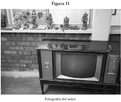 En el mismo panel donde se exhibe un televisor de los años setenta, perteneciente a una familia notable del pueblo, se desparraman atrás, como asomando de la pantalla, diferentes figuras arqueológicas de cerámica (véase la figura 11). "Ah no, ésas son aztecas, creo. Las trajeron de la capital. Pero son, cómo decirle, muy de museo, ¿no? Por eso las pusimos." El efecto-museo no puede ser más claro: la figura azteca va en un museo, porque ahí pertenece, al orden intemporal del objeto exhibido. "Los aztecas", en su historia, son otro asunto. Igual que los irritilas. "No, pues ya no hay ninguno. Hace mucho, muchísimo." Extranjeros sí, los hijos. Indios no, ninguno. En una poderosa sintaxis narrativa que ubica la ruina en el paisaje y la etnia en la extranjería, el resultado es el mismo que la vertiente crítica de la antropología y la historia enfatizan como el núcleo donde hace síntoma la historia nacional: la expulsión de la figura del indio en el presente. La historia se antropologiza y el indio es por siempre diversidad, estampa y tradición. La historia es mestizaje y nación. Su fundamento, la ruina. El hiato que separa aquel indio de esta diversidad es puro síntoma.