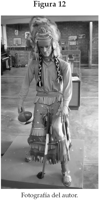 En medio de la sala central del museo, aunque de cara a la puerta de "salida",37 una escultura en cera de un hombre caracterizado con la vestimenta típica para representar a los indígenas del oeste norteamericano ocupó el centro de mi atención. Es la única figura antropomorfa del museo en tres dimensiones, con representación a escala real. La imagen de piel blanca, rasgos marcados, vestido con camisola rosada y penacho de plumas, genuflexo sobre un pedestal verde, medias rosadas en compossé y huaraches (véase la figura 12), resulta, por lo menos, extraña en el lugar. Nuevamente sin cédula, sin anclaje explicativo alguno. Pero por el tamaño y la disposición, sin duda "central" en la museografía.