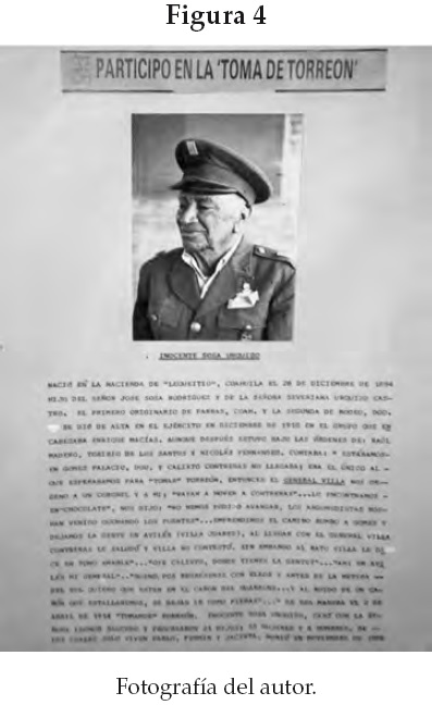 15 Una de las fotografías interesantes de la sala, al costado del acta de nacimiento de Pancho Villa, es la del señor Inocente Sosa Urquizo, nacido en 1894 en Parras, Coahuila, y quien habría participado en la toma de Torreón de 1914 (véase la figura 4). Debajo de la fotografía se exponen los recuerdos de lo que narraba Urquizo en voz de una de sus hijas. Lo interesante es que en la cédula, que empieza señalando "así fue como tomamos Torreón", lo que se registra no son los hechos militares ni la lógica del asalto a la ciudad, sino los parlamentos del líder con el lugareño, el tono de voz de Villa, la mirada con la que se dirigía a su subalterno: la prueba de su humanidad y de la interacción del pueblo con el héroe revolucionario. La fortaleza del formato épico en la relación del héroe de bronce con el pueblo raso muestra la omnipresencia desdoblada de la nación.