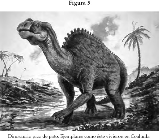 • Una fotografía a modo de caricatura gráfica de un "dinosaurio pico de pato". Con la leyenda "ejemplares como éste vivieron en Coahuila" (véase la figura 5).19