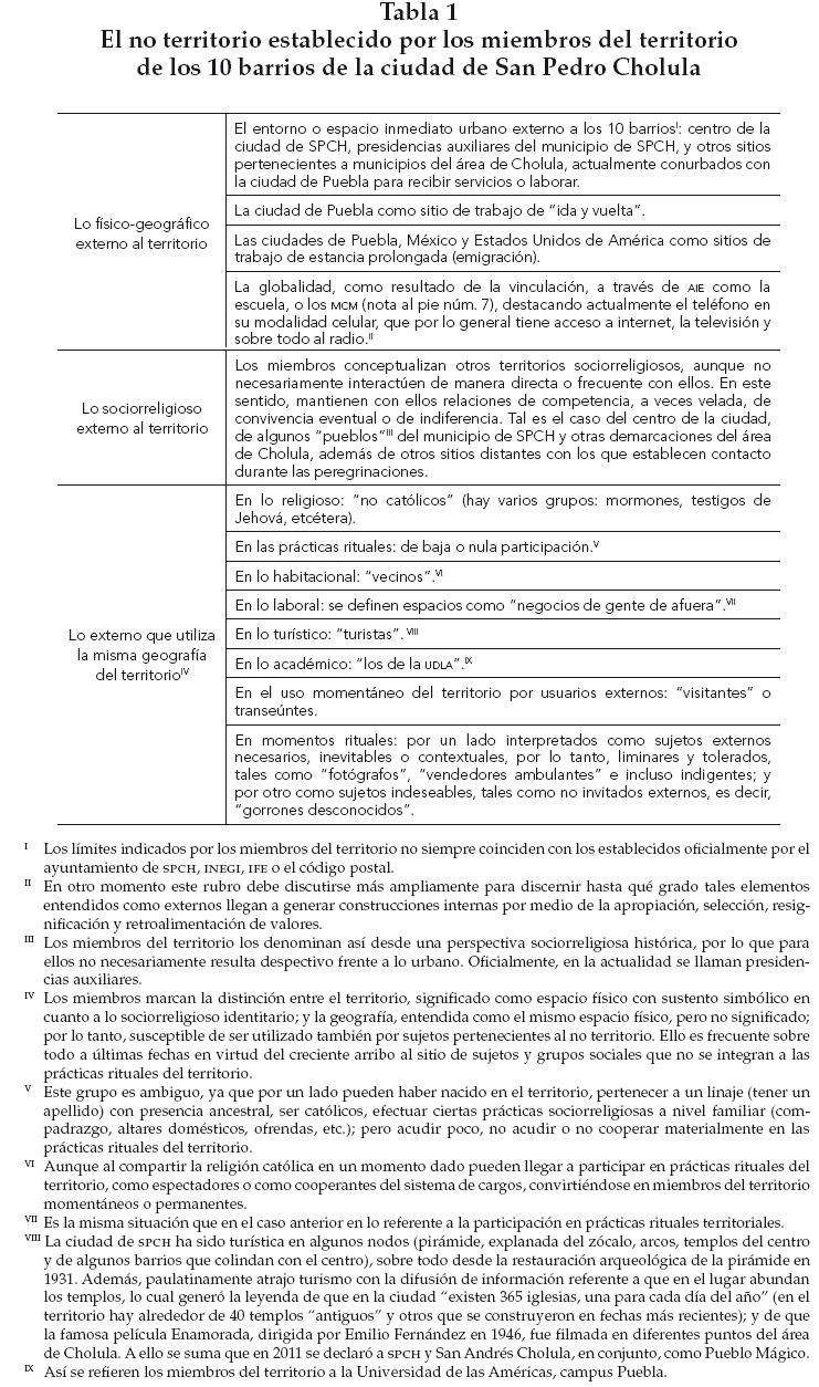 Los diez barrios de la ciudad de San Pedro Cholula, Puebla, México, son integrados por sujetos que conforman un territorio sociorreligioso y que poseen memoria colectiva, resultado de la apropiación, lo que se significa en prácticas rituales, sustentadas en el sistema de cargos, que se reflejan en calendarios y ciclos rituales, lugares y trayectorias sagrados, que en conjunto sustentan una identidad local en el contexto urbano.