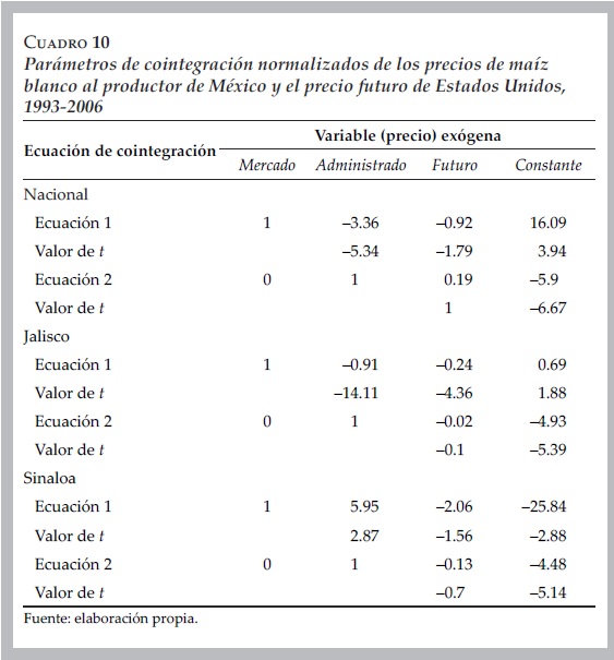 Con excepción de la ecuación de cointegración del precio al productor de mercado de Jalisco, todas las constantes son estadísticamente diferentes de cero a 95% de confianza y todos los coeficientes del precio futuro son cero (véase el cuadro 10). Lo anterior es otra evidencia de que el precio futuro del maíz amarillo US # 2 de la Bolsa de Chicago de Estados Unidos no predice eficiente e insesgadamente los precios físicos de maíz blanco al productor de México.