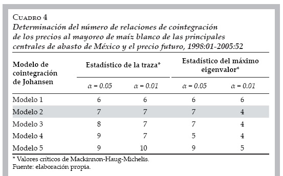 El modelo de cointegración multivariada # 2 de Johansen (1991 y 1995) representa mejor las propiedades de la series estacionarias de precios al mayoreo, el cual muestra que el número de relaciones de cointegración es de siete (véase el cuadro 4).