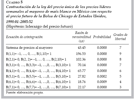 Mediante el estadístico de la razón de verosimilitud (LR) de Johansen y Juselius (1992) se contrasta la hipótesis de la integración perfecta o ley del precio único (véase el anexo 2). La hipótesis nula es que el precio futuro de la Bolsa de Chicago es el precio único de todo el sistema de precios al mayoreo de México. También se contrastan las hipótesis individuales de que el precio futuro es el precio único para cada uno de los precios al mayoreo (véase el cuadro 5). La conclusión es contundente: el precio futuro no es el precio único y líder de los precios al mayoreo de maíz blanco de México, ni en forma sistémica ni en forma individual.