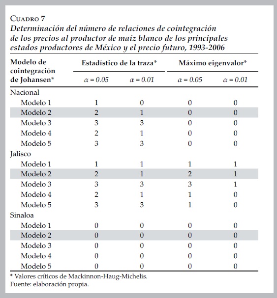 Con respecto a los precios al productor, el modelo de cointegración más apropiado es el modelo 2 que supone la existencia de intercepto y la inexistencia de tendencia lineal tanto en las series de precios como en el espacio de cointegración. A un nivel de significancia de 5% se verifica que a nivel nacional y en Jalisco, los precios al productor tienen dos relaciones de cointegración, pero los precios de Sinaloa no presentan un solo vector de cointegración (véase el cuadro 7).