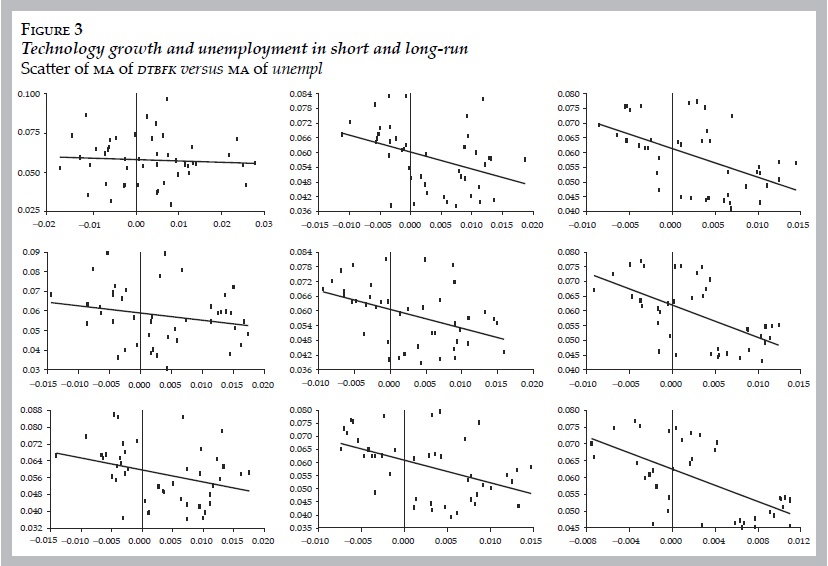 To explore the possible long-run relation among the technology growth and the unemployment we generate scatter plots of their moving averages at various bandwidths (see figure 3).