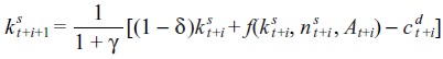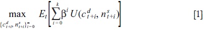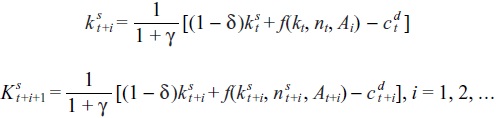 where superscripts d and s stand for demand and supply, β designates the intertemporal preference rate, δ the depreciation rate, π firms' profits and Y stands for the stationarity parameter. Using standard dynamic programming techniques, this optimal planning problem can be solved to yield the solution sequence {cdt+1, nst+i}∞i=0; however, from each sequence only the first tupel (cdt, nst) is actually carried out.